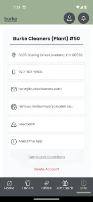 5) Quickly contact Burke Cleaners by phone or email and access their website all directly from your device.