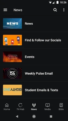 – In tab 3, keep your finger on the "Pulse" of latest happenings with a curated feed of Latest News, Events Calendar, Scott's Thoughts, Socials, Latest Elders Letter, and forms to Get general FCC and ministry-specific emails, texts, and push notifications.