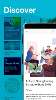 The Discover feed is updated regularly with inspiring articles, videos, audio, and images. It will include links to current Come, Follow Me lessons to support gospel learning. Additionally, you can explore ideas for service, activities, and personal goals.