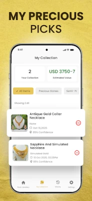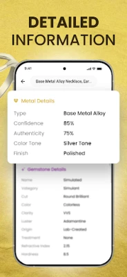 Keep your scans organized with an in-app scan history and collection. View all your previously identified jewelry pieces, including images, types, authenticity levels, and value estimates — all in one place.