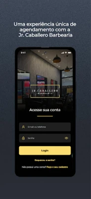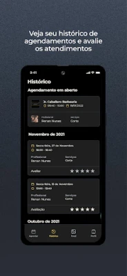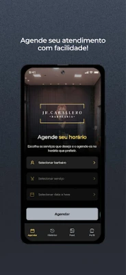 Através do App Jr. Caballero Barbearia os clientes podem realizar seus agendamentos de uma forma muito mais prática. Na tela inicial, é possível selecionar os serviços e horário desejado para seu próximo atendimento. Já na tela de histórico, você poderá avaliar como foi o seu atendimento, remarcar ou cancelar seus agendamentos. É possível também na tela do perfil o cliente editar suas informações, como e-mail, foto de perfil e telefone.