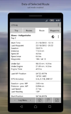 ➤ An editable waypoint-list for each route of your trip lets you create a detailed diary of your complete journey. LD-Log will allow you to enter text or shoot photos in-app as well as import them at a later time. As a sailor, use the sail mode which lets you keep a complete nautical ship's log in an intuitive manner. Many different options are available for convenient storage of trips, routes and journals.